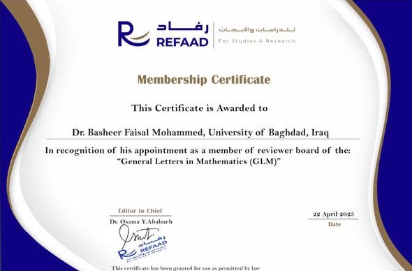 يسر المركز الوطني للدراسات السكانية والديموغرافية في جامعة بغداد أن يعلن عن اختيار الأستاذ المساعد الدكتور بشير فيصل محمد، رئيس قسم التقنيات التحليلية في المركز، مقيماً علمياً للبحوث في مجلة General Letters in Mathematics (GLM). تعد مجلة GLM مجلة محكمة ومفتوحة الوصول، تهتم بنشر الأبحاث الأصلية في جميع مجالات الرياضيات، وتهدف إلى توفير منصة مرموقة لنشر الاكتشافات الرياضية الهامة. وتُصدر المجلة بشكل ربع سنوي من قبل دار النشر Refaad، وهي تسعى إلى تسليط الضوء على مساهمات علماء الرياضيات في منطقة الشرق الأوسط والدول العربية، بالإضافة إلى الترحيب بالمشاركات عالية الجودة من الباحثين حول العالم. نتمنى للأستاذ المساعد الدكتور بشير فيصل المزيد من النجاح في هذا الدور المتميز، ونتطلع إلى المزيد من الإنجازات العلمية التي ستساهم في تعزيز مكانة الجامعة والمركز على المستوى المحلي والعالمي.