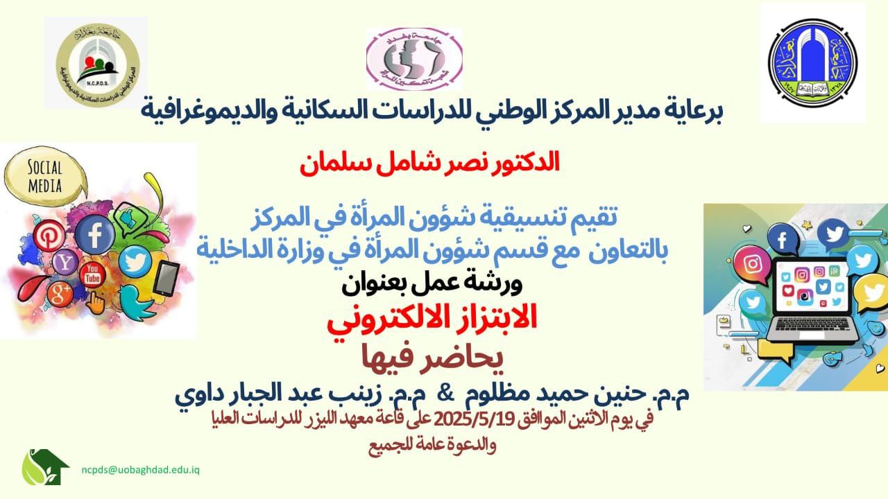 تقيم مسؤول تنسيقية شؤون المرأة في المركز م د.منى عبد النبي وبالتعاون مع قيم شؤون المراة في وزارة الداخلية ورشة عمل بعنوان “الابتزاز الاكتروني” في يوم الاثنين الموافق 2025/5/19 يحاضر فيها كل من م.م حنين حميد مظلوم و م.م زينب عبج الجبار داوي.