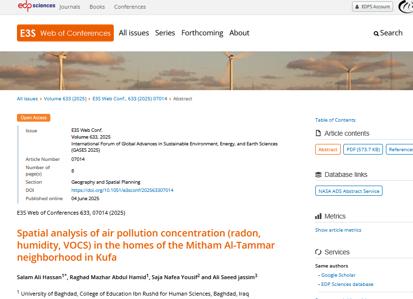 التحليل المكاني لتركيز تلوث الهواء (الرادون، الرطوبة، المركبات العضوية المتطايرة) في منازل حي ميثم التمار في الكوفة